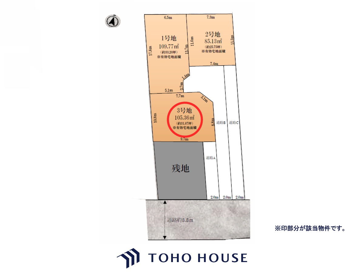 - ■道路部分持分26.38平米■木造で地階を有しない階数が3階建以下の住宅建築計画または更地利用の方へ向けた土地販売です。 ■土地面積は有効宅地面積です。